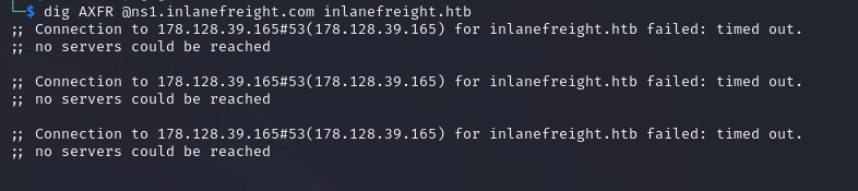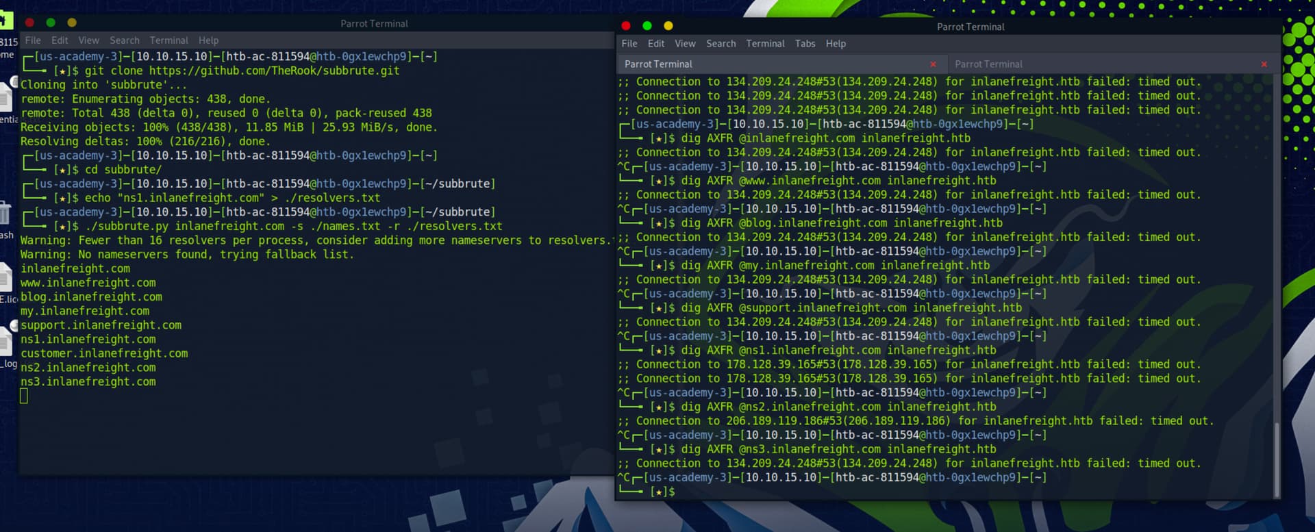 For anyone still confused you have to update the /etc/host file with the (ip) then ns1.inlanefreight.htb, after that use subbrute. Make sure the resolver.txt is updated correctly with inlanefreight.htb & do not use .com wait like 5-10 minutes for results. Finally use dig for zone transfer. DM me if you still canāt figure it outā¦