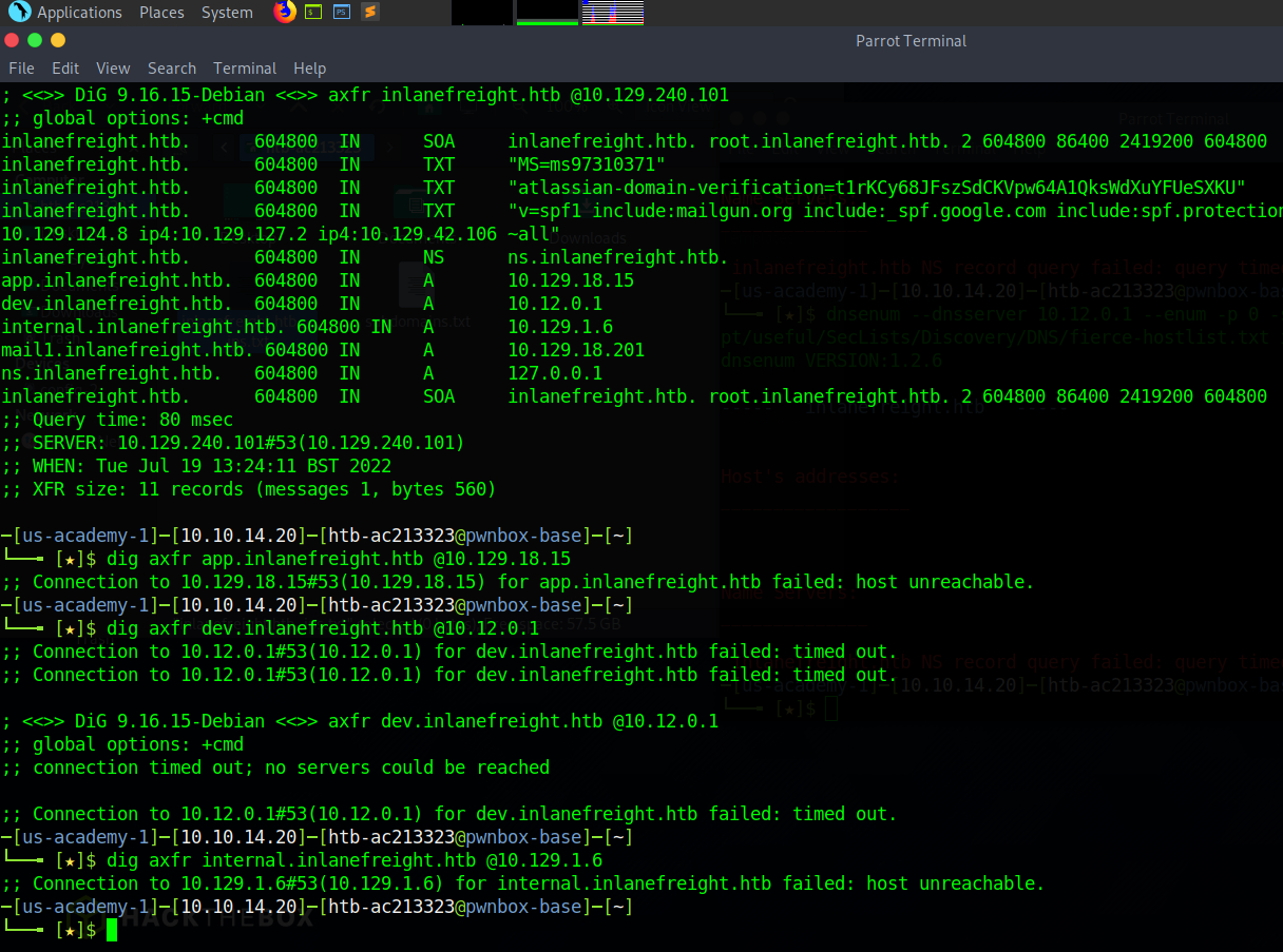 I tried zone transfers on all the subdomains for inlanefreight.htb seems like internal.inlanefreight.htb is the only subdomain I found that responds to the transfer. I found a bunch more subdomains in internal.inlanefreight.htb and tried both zone transfer and brute force (dnsenum) with the fierce wordlist. I cannot seem to find anything ending in .203 IP… I also tried brute force on all the subdomains from inlanefreight.htb as well.
