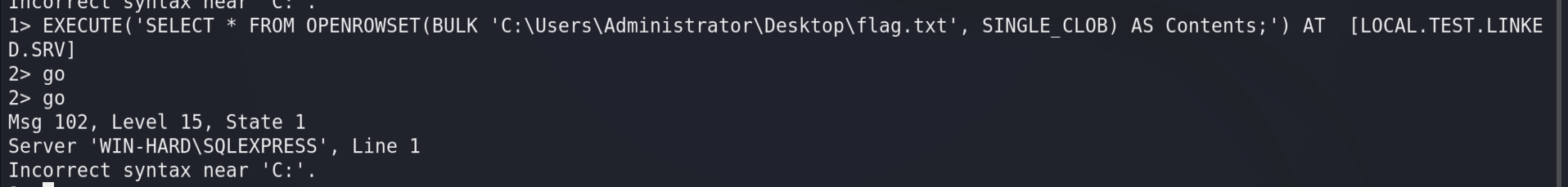 [-] ERROR(WIN-HARD\SQLEXPRESS): Line 1: Linked servers cannot be used under impersonation without a mapping for the impersonated login.