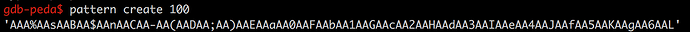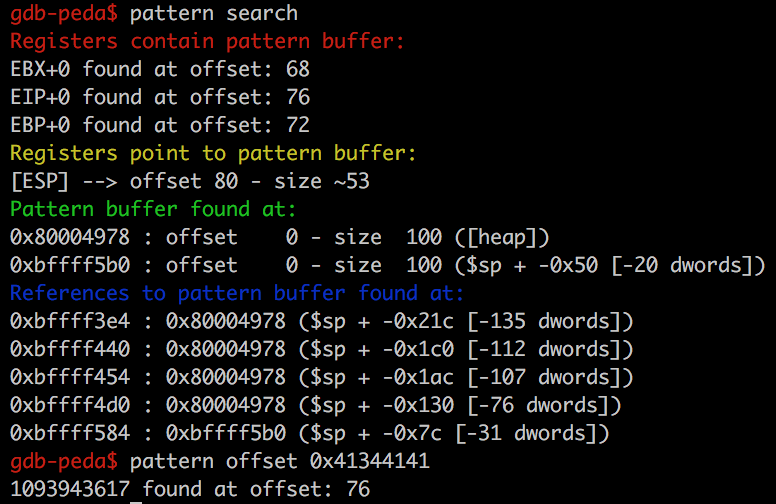 So to find the pattern, we can either run pattern offset 0x41344141 or just pattern search. Here I’ve shown the output of both, which both show that eip can be overwritten at offset 76.