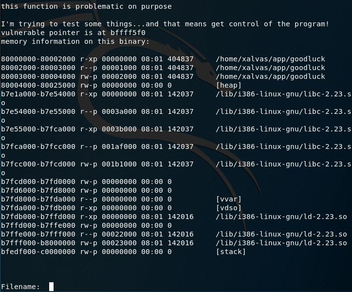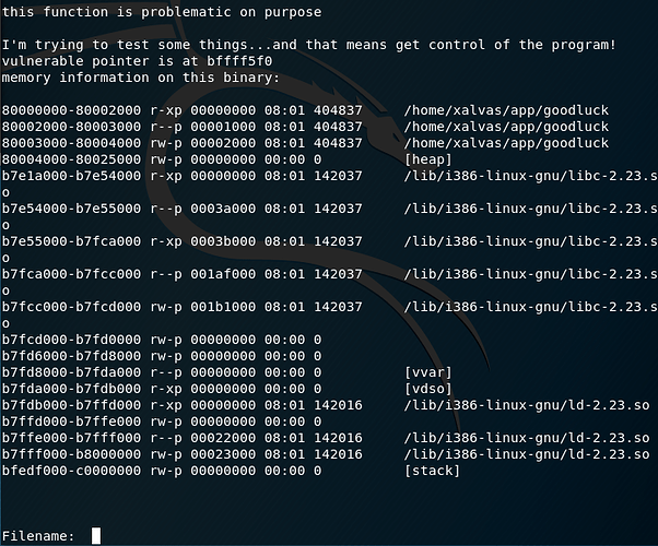 So we’ve got all this way and now we’ve been greeted by the memory layout of the process and a pointer to a vulnerable buffer.