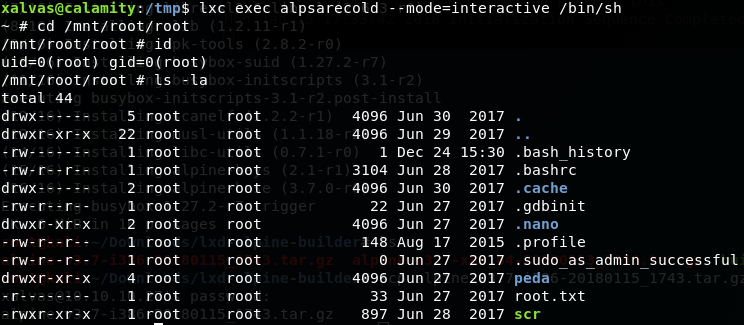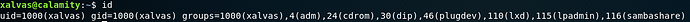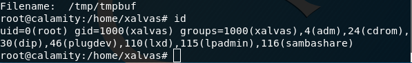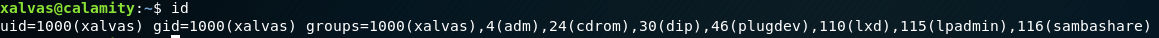 uid=0(root) gid=1000(xalvas) groups=1000(xalvas),4(adm),24(cdrom),30(dip),46(plugdev),110(lxd),115(lpadmin),116(sambashare)