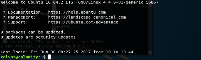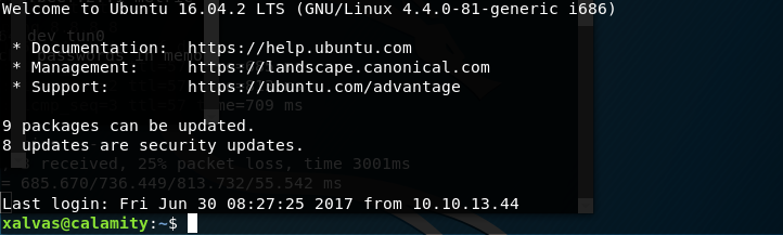 We try to SSH in with this password and the username xalvas, and we’re successfully authenticated.