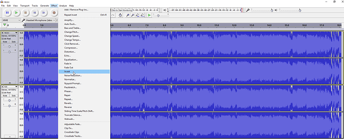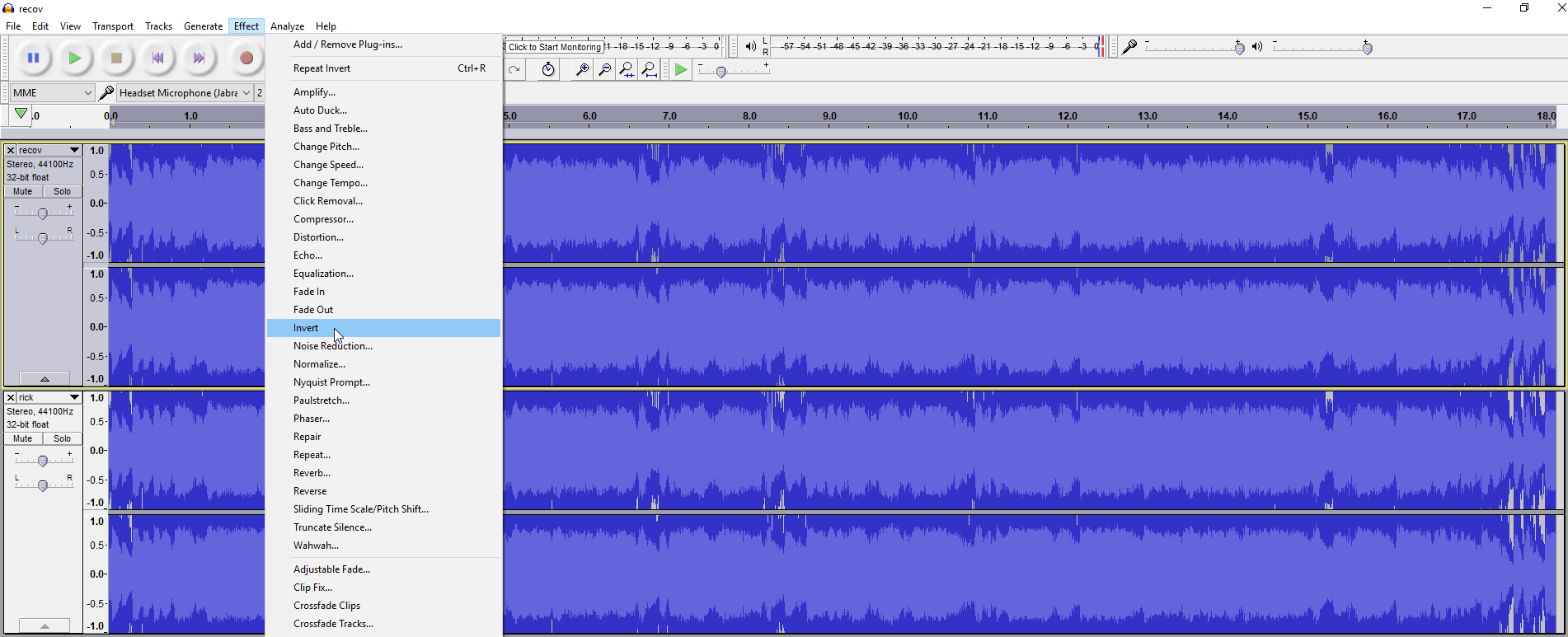 Since an audio signal is nothing more than a wave, by inverting it and summing the resulting waves, we’re left with the resulting signal. To set this up in the same way load both files into audacity, select one of the tracks and choose the Effect->Invert option. This will cancel out the Rick Astley segment of the track, allowing us to hear any hidden messages.