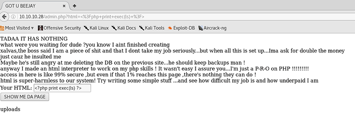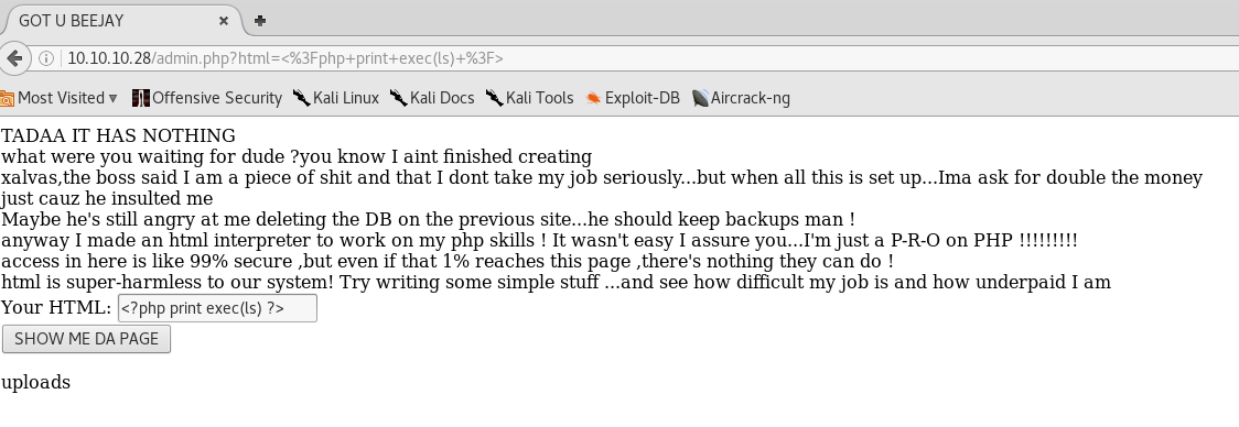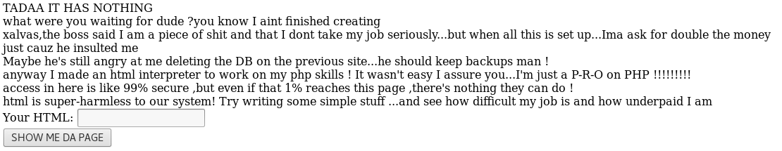 We see 1337 hacker has created an impenetrable wall that no man could possibly bypass, but it’s nice he’s included a little HTML renderer. I wonder if forgp has had some poor colleagues in the past?