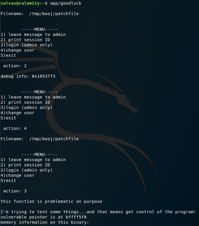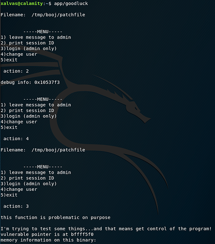 So we now have user, and access to the app folder in xalvas’ home directory. We’re greeted with an suid application called goodluck, and the source code of the app itself. Let’s analyse the application, see what protections are in place and see what we can do in the app itself.
