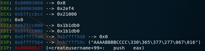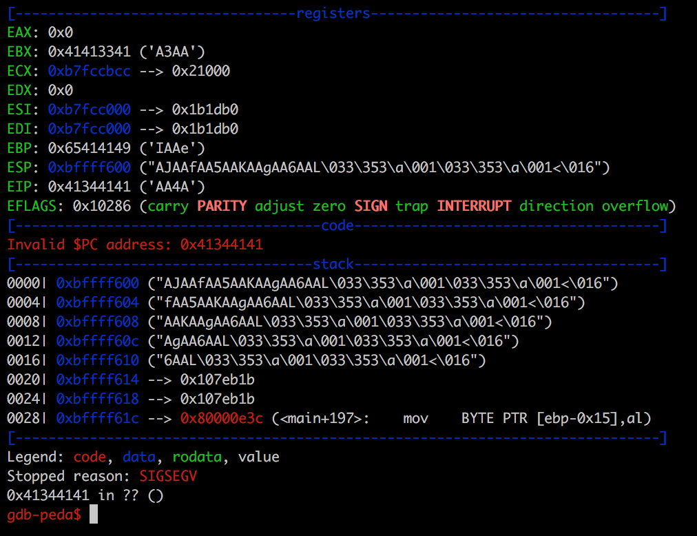 We’ve got more than enough space to load our buffer, so presumably this is a simple eip overwrite. Let’s quickly run a test with some basic shellcode after we work out the eip offset.
