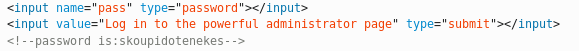A quick peek at the source reveals our password for the page. Note that the Username and Password fields are the wrong way round and the username and password should be input as normal.