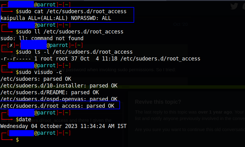 But it didn’t take, and parrot still asks for my password when invoking sudo permissions. So I tried: