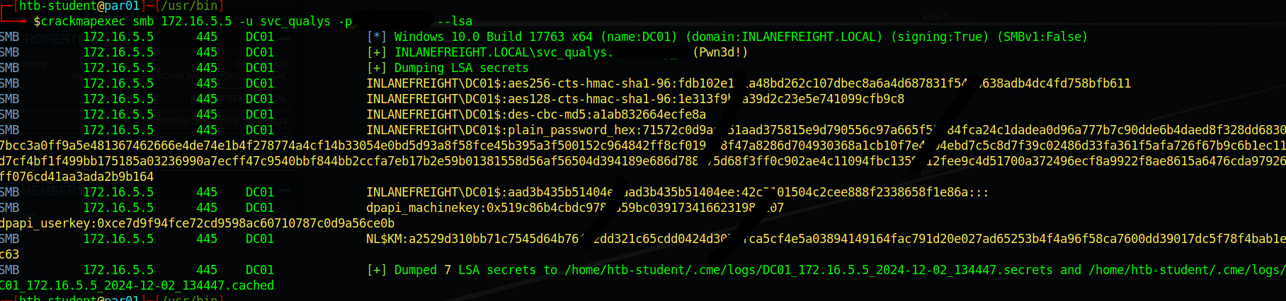 Hi, I don’t know if I’m missing something but I tried to find local admins of DC01. It seems that every member of the Domain Admin groups is Admin to DC01 (so svc_qualys, solarwindsmonitor etc) I got passwords of two of them and tried to dump lsa and sam hashes with crackmapexec. I got sam for Administrator but didn’t succeed to crack it or pth with it. I found 7 lsa secrets but none of them seems to belong to a domain user.