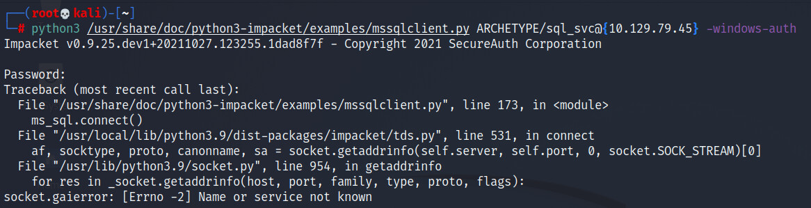 socket.gaierror while using mssqlclient. I also made sure i was conneted to vpn while using the command. Someone please help