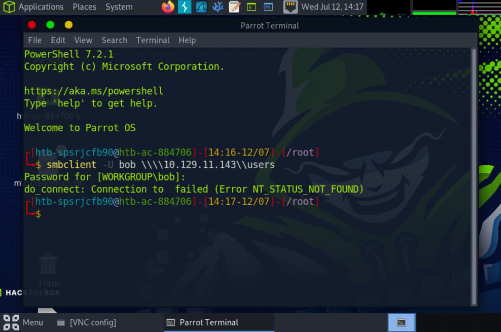 I’m trying to complete the last question in this section, and I’m entering the password for bob that appears in the section for the smbclient connection but it throws me an error that I just don’t know how to deal with