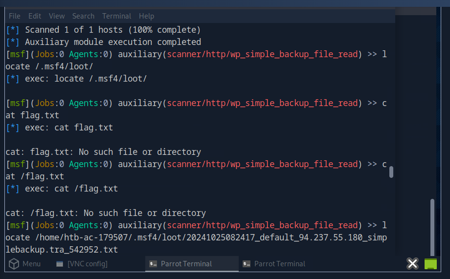 you actually need to use the cat command with the whole link: cat /home/htb-ac-1354933/.msf4/loot/20241105051031_default_94.237.63.109_simplebackup.tra_885363.txt