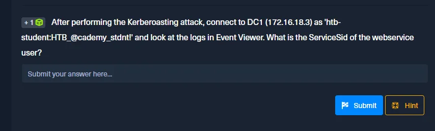 How to get the answer to this question in WINDOWS ATTACKS & DEFENSE module? I checked the event log but I could not find it please help.