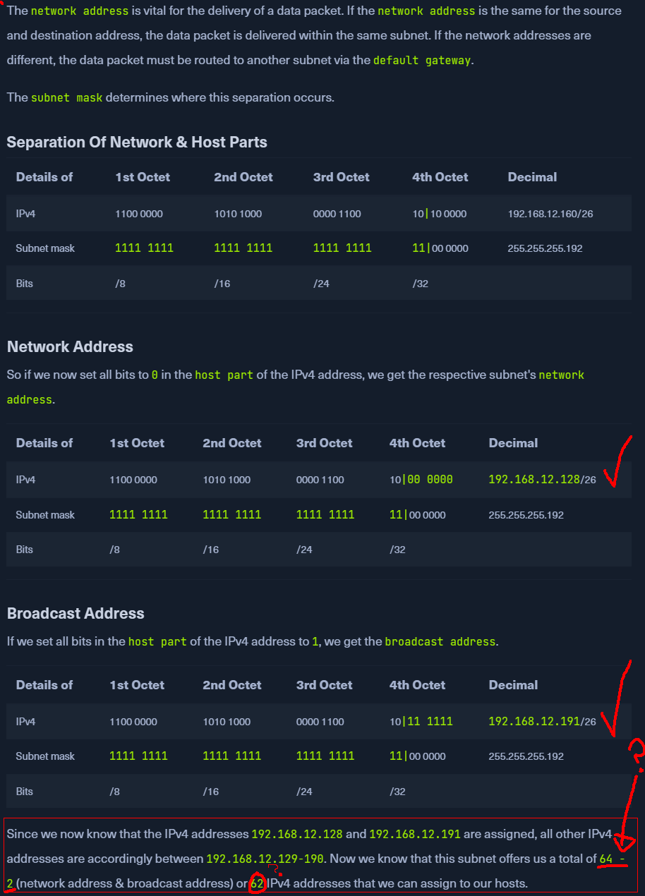 Question: Where, for the love of god, does it find the 64 - 2 portion or 62, aka (the network address & broadcast address) that we can assign to the hosts? What bugs me is that it just blatantly says here is what it is, but without giving a reason behind why it is that way. It’s been a headscratcher for quite some time and I still cannot find out. Without this, I cannot understand the part beneath about Subnetting Into Smaller Networks.