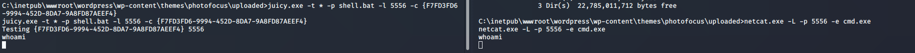 I got the WordPress admin password, modified a PHP file to upload Netcat and JuicyPotato. With Netcat I had a revershe shell. I am in the DOS shell as user “nt authority\iusr”.