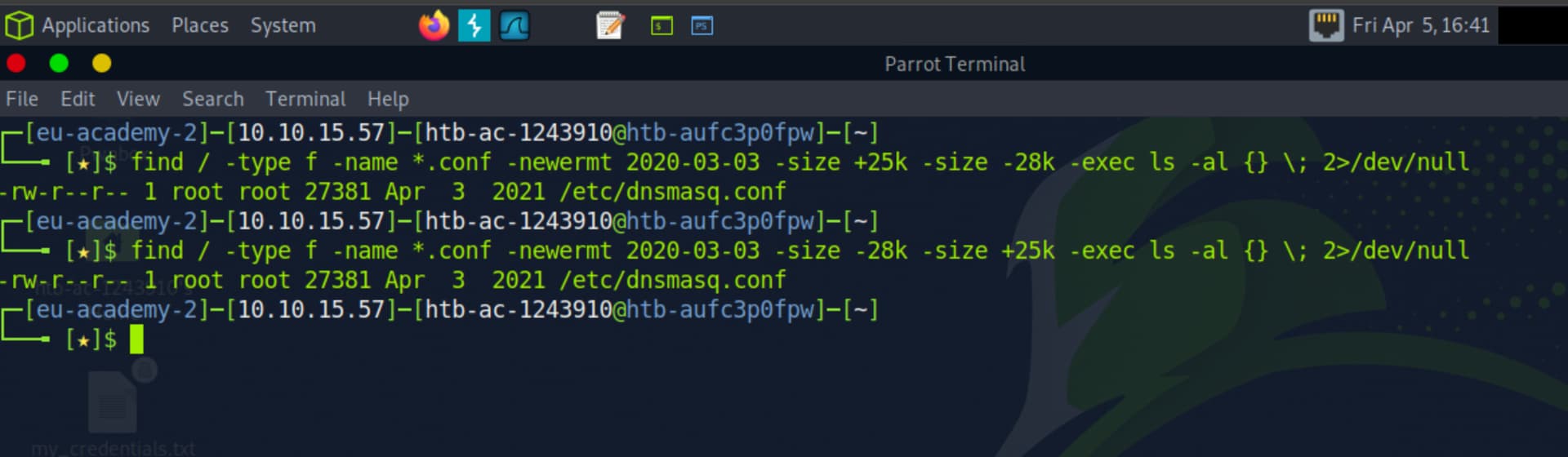 how?? i typed in this command and got find: missing argument to `-exec’ i just want to know what the command means and how i go about finding the specific requirements to find this file i originally have typed find / -type f -iname “*.conf” -size +25k -size -28k -newermt 2020-03-03 2>/dev/null and got one file /etc/dnsmasq.conf how did i not get what you got??
