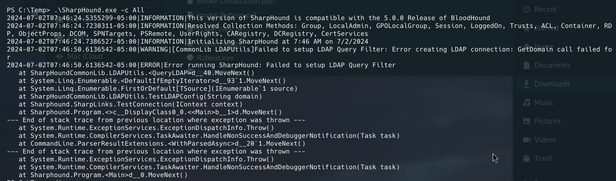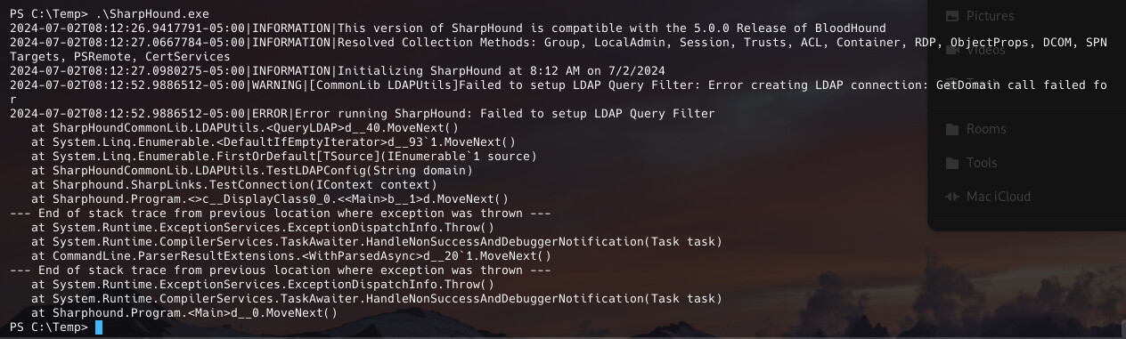 Then with SharpHound.exe, I get a LDAP error