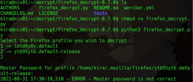 I did it right now. Logged in as kira, firefox_decrypt, second item and done. Have you downloaded the firefox_decrypt from github?