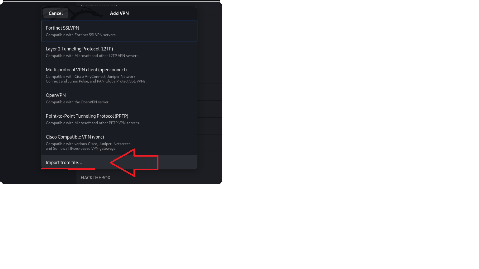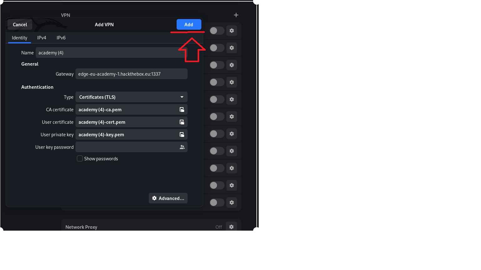 After that, you download the configuration file and create a new VPN interface in the settings of the Kali machine, where you import the configuration file without specifying a login and password!