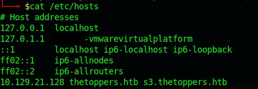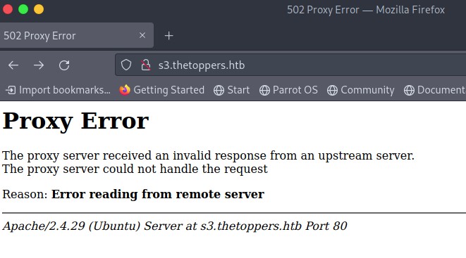 I also noticed that when I use gobuster as the writeup suggests, I am getting “s3.thetoppers.htb (Status: 502)”, where the write-up indicates that I should get “Status: 404”.