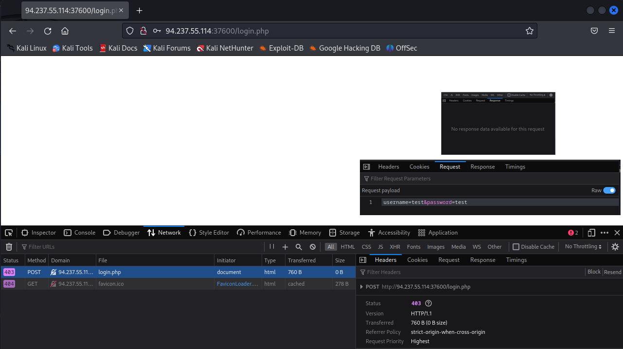curl -X POST IP:PORT/login.php --user “test:test” returns the html i used for the F string. Wasnt seeing any results so i changed the F string from the provided “<form name=‘login’” to “‘login’ autocomplete” just to be safe about the additional ‘=’ in the string. I used curl because when attempting a login using bad credentials in the browser nothing is returned except for a 403 (forbidden) status, and you are brought to a white page. However when attempting the same request using curl you do get a response.