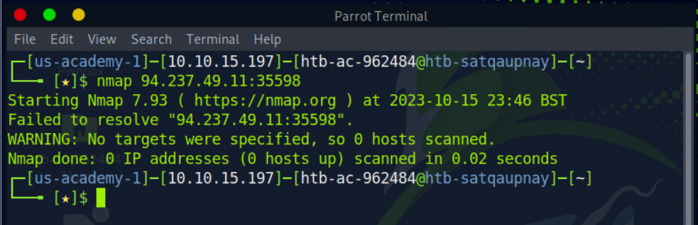 I do not know what is going on, but when I try to run the NMAP scan on the server, I keep getting the error below. Any explanation to what I’m missing would be greatly appreciated.