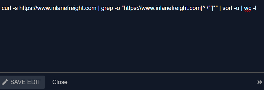 I DID IT WITH THIS < sudo curl https://www.inlanefreight.com | tr " " “\n” | cut -d’“’ -f2 | cut -d”'" -f2 | grep https://www.inlanefreight.com | grep -v src | sort -u | wc -l 2>/dev/null >
