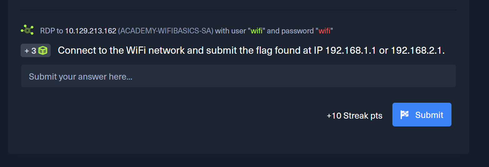 Connect to the WiFi network and submit the flag found at IP 192.168.1.1 or 192.168.2.1.